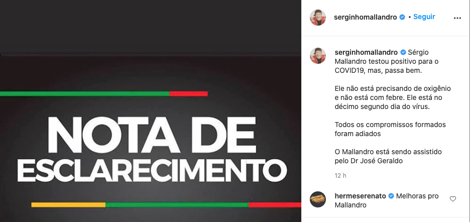 "Sérgio Mallandro testou positivo para a covid-19, mas, passa bem. Ele não está precisando de oxigênio e não está com febre. O Mallandro está sendo assistido pelo Dr José Geraldo", diz a nota.