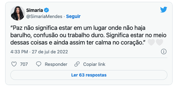 “Paz não significa estar em um lugar onde não haja barulho, confusão ou trabalho duro. Significa estar no meio dessas coisas e ainda assim ter calma no coração", escreveu ela no Twitter. Logo os internautas interagiram com a publicação