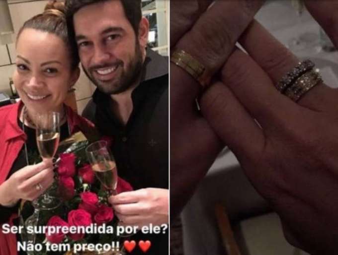 A cantora contou ainda como foi o momento. “Foi no hotel, sábado, dia 11. Nós marcamos de jantar. Tinha um pianista no hotel tocando. O Riquelme e a esposa, a Thamyres, estavam próximos ao piano e eu encostei. Pedimos que ele tocasse ‘Garota de Ipanema’ e comecei a cantar com ele. Depois disso, o Rique pediu que o pianista tocasse a música ‘Proposta’, do Roberto Carlos. Daí, o Leandro surgiu com um lindo buquê de rosas vermelhas e as alianças”, contou.