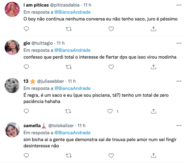 Solteira após se separar de Fred Desimpedidos, com quem tem o filho Cris,, Bianca Andrade percebeu uma mania que parece ser tendência para a maioria homens na hora de flertar: fingir desinteresse.