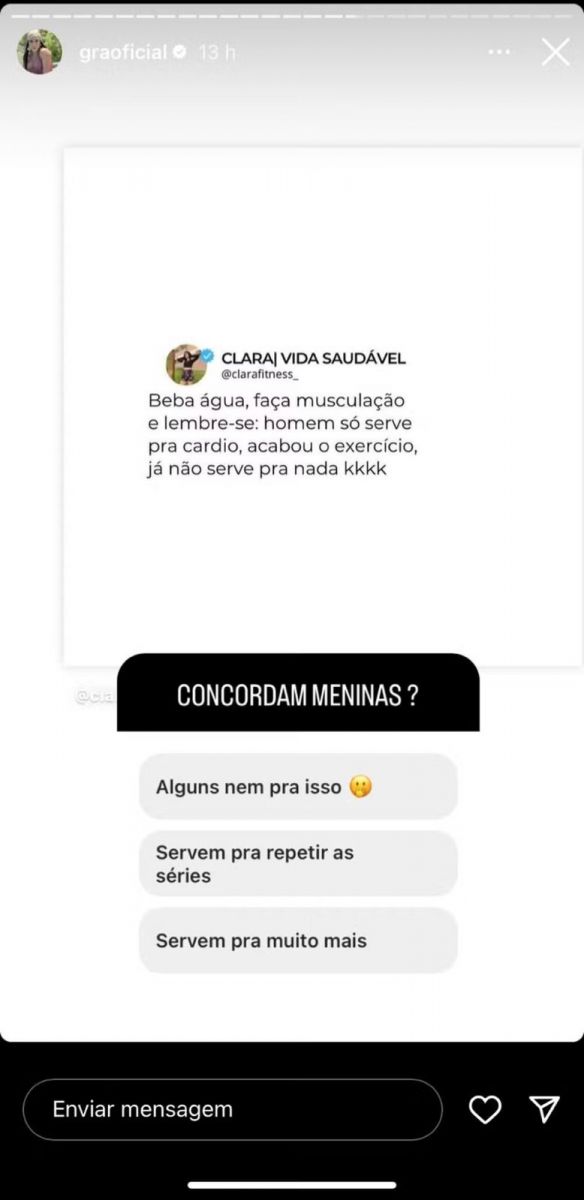 Gracyanne, então, perguntou das seguidores numa enquente: “Concordam, meninas? Alguns nem pra isso, servem para repetir as séries ou servem para muito mais?".