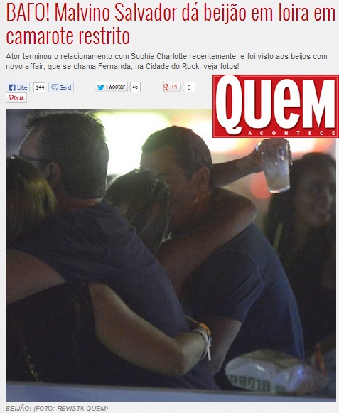 Malvino Salvador (37) anunciou o fim do namoro com Sophie Charlotte (24) durante o primeiro dia do Rock in Rio, na sexta-feira (13), e não teve tempo para lamentar. No segundo dia do festival de música, o protagonista da novela das 21h da TV Globo, "Amor à Vida", já curtia a solteirice aos beijos com uma loira de 18 anos, mais tarde identificada como Fernanda Carbonelli, de apenas 18 anos.