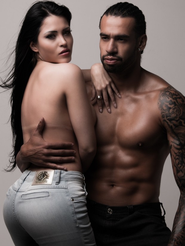 Candidata ao Miss Bumbum representando o Paraná, Cláudia Alende, posou ao lado do jogador de vôlei Thiagão para as lentes do fotógrafo Rodrigo Amatuzzi.