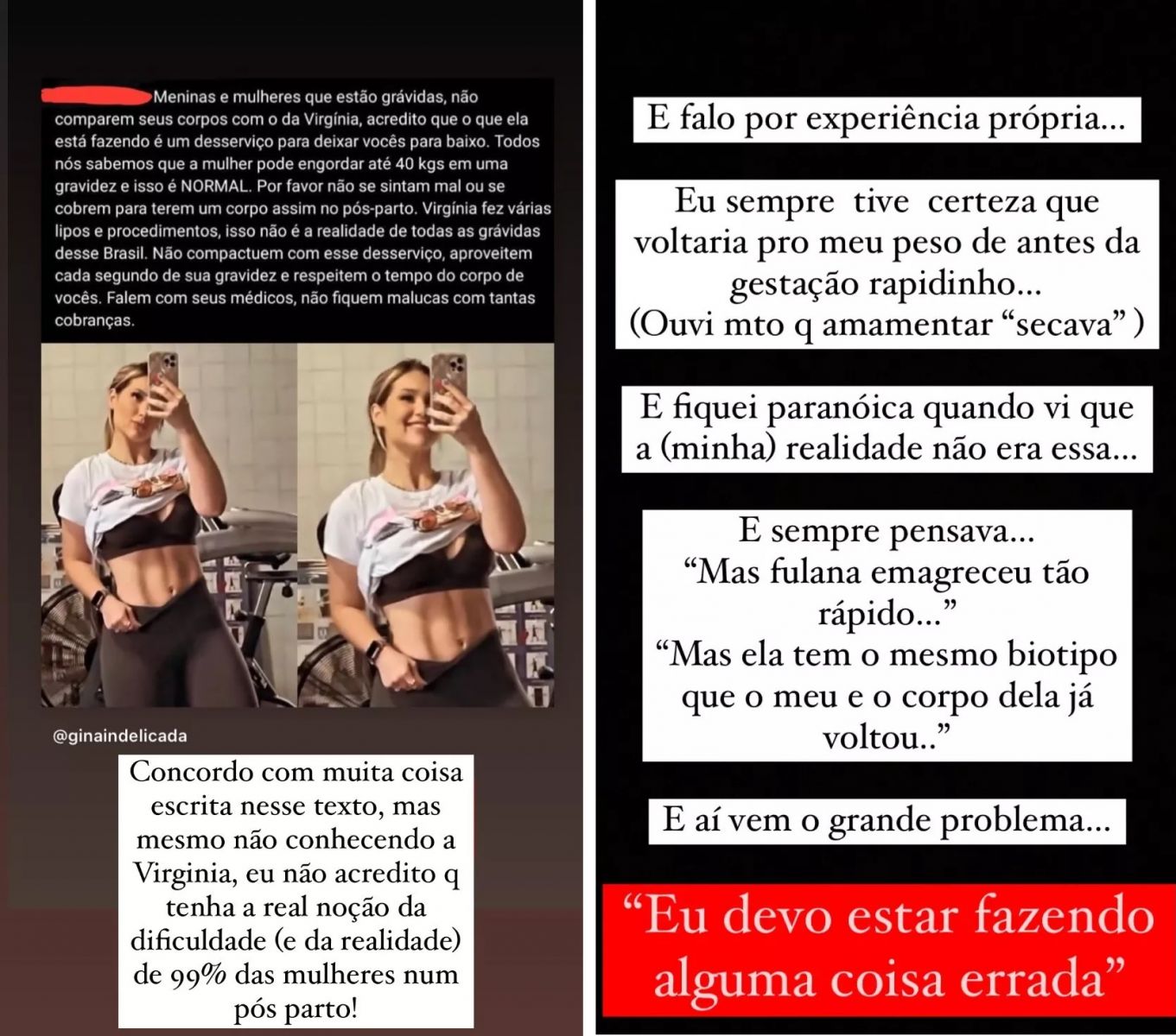 “Mesmo não conhecendo a Virgínia, eu não acredito que tenha a real noção da dificuldade e da realidade de 99% das mulheres num parto. Digo isso por experiência própria. Eu sempre tive certeza que voltaria para o meu peso de antes da gestação rapidinho e fiquei paranoica quando vi que a minha realidade não era essa. E sempre pensava: ‘mas a fulana emagreceu’, ‘mas ela tem o mesmo biotipo que eu e voltou’. E aí vem o grande problema”, começou Sthefany.