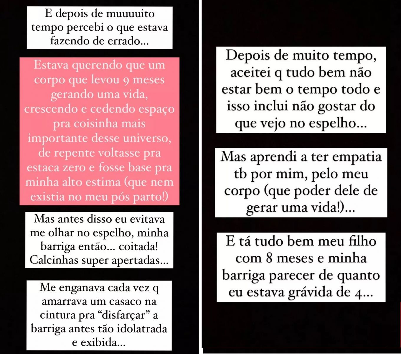 “Depois de muito tempo, descobri o que estava fazendo de errado. Estava querendo que um corpo que levou 9 meses gerando uma vida, crescendo e cedendo espaço para a coisinha mais importante desse universo, de repente voltasse para a estava zero e fosse base para a minha autoestima. Antes disso eu evitava me olhar no espelho, minha barriga então, coitada, calcinhas super apertadas (...). Mas aprendi a ter empatia por mim, pelo meu corpo”, continuou.