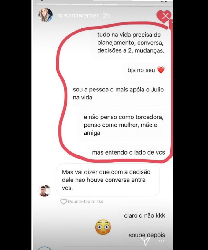 “Tudo na vida precisa de conversa, decisões a dois, mudanças. Sou a pessoa que mais apoia o Julio na vida. E não penso como torcedora, penso como mulher, mãe e amiga. Mas entendo o lado de vocês”, disse.