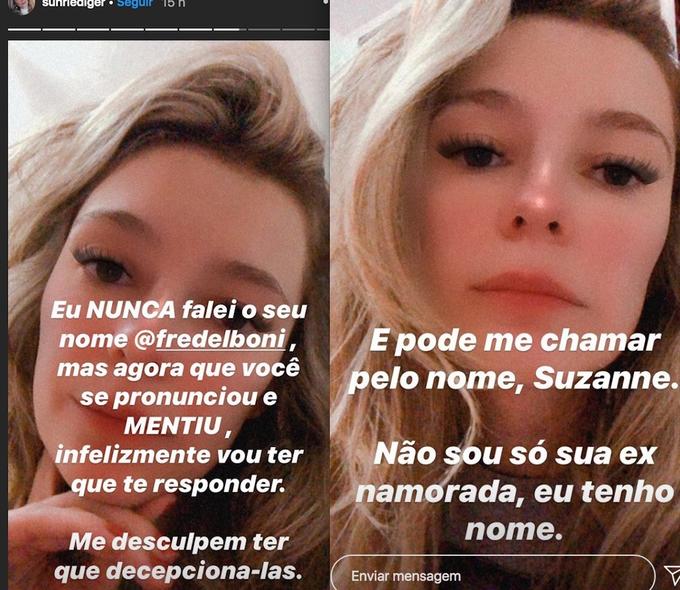 Depois da declaração de Fred, Suzanne então o acusou de ter mentido. “Eu nunca falei seu nome Fred, mas agora que você se pronunciou e mentiu, infelizmente vou ter que te responder. Me desculpem ter que decepciona-las. E pode me chamar pelo nome, Suzanne. Não sou só sua ex-namorada, eu tenho nome”, escreveu no stories.