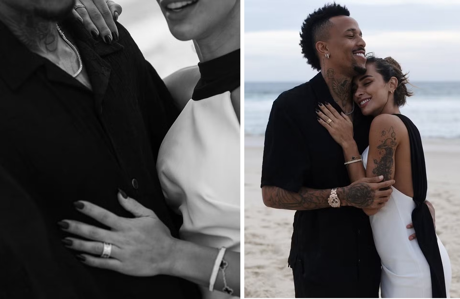 Nesta sexta-feira (11), a influenciadora Tainá Castro, 29, se declarou ao jogador Éder Militão, com fotos de um ensaio romântico do casal, publicado no Instagram. Nas imagens, os dois aparecem trocando beijos e abraços em uma praia, exibindo alianças de compromisso. "Você me traz paz", escreveu ela na legenda.