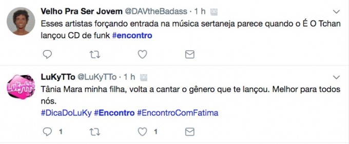 “Pelo amor, Tânia Mara é ruim demais”, criticou uma pessoa. “Quanta desafinação, Tânia Mara”, disse outro.