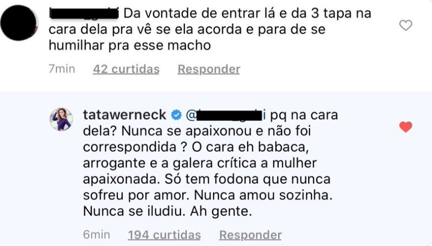 Tatá comentou em um post que dizia: “Dá vontade de entrar lá e dar 3 tapas na cara dela pra vê se ela acorda e para de se humilhar pra esse macho”.