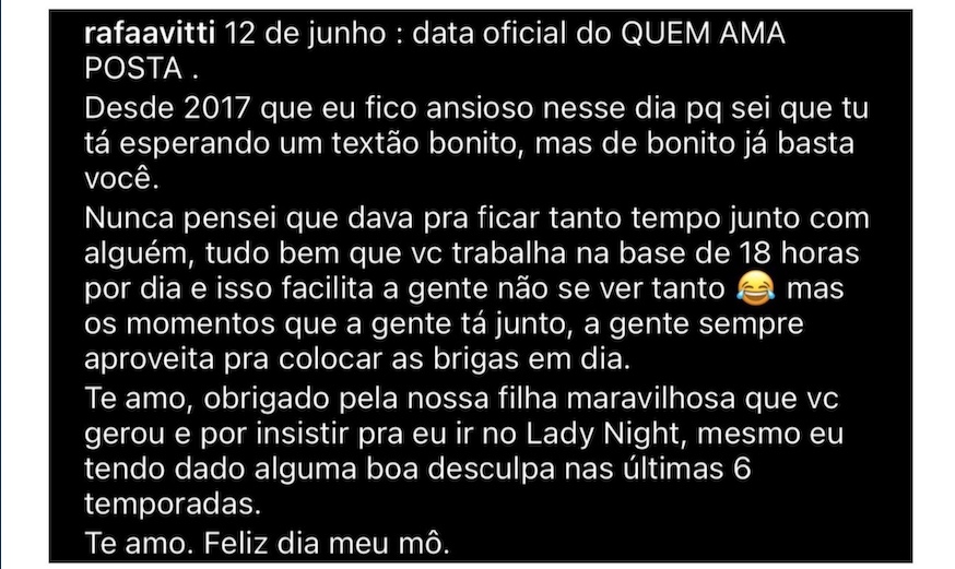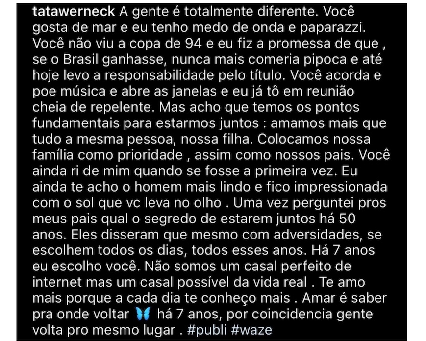O ator optou por escrever um texto mais voltado para o humor, parecido com o que costuma fazer a amada. Já Tata falou sobre as diferenças do casal e que, mesmo assim, ama o ator cada dia mais. Confira: