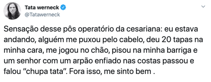 "Sensação desse pôs operatório da cesariana: eu estava andando, alguém me puxou pelo cabelo, deu 20 tapas na minha cara, me jogou no chão, pisou na minha barriga e um senhor com um arpão enfiado nas costas passou e falou 'chupa, Tatá'. Fora isso, me sinto bem", escreveu.