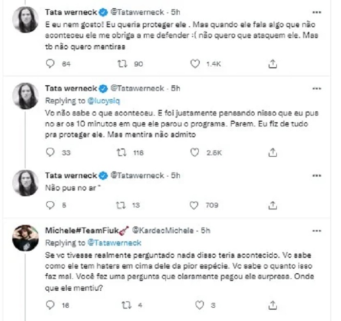 Tatá prosseguiu respondendo internautas que atacavam: “Vc não sabe o que aconteceu. E foi justamente pensando nisso que eu não pus no ar os 10 minutos em que ele parou o programa. Parem. Eu fiz de tudo pra proteger ele. MAs mentira não admito”.