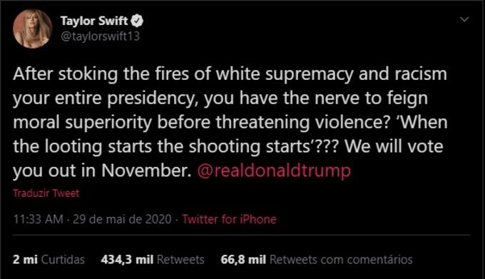 "Após inflamar a supremacia branca e o racismo durante toda a sua presidência, você tem coragem de fingir superioridade moral antes de ameaçar com a violência?", escreveu Taylor, em seu perfil do twitter. Ela também relembrou um tuíte antigo de Trump em que ele diz "Quando os saques começam, o tiroteio começa", e estrela pop afirmou: "Votaremos pela sua saída em novembro, @realdonaldtrump.".