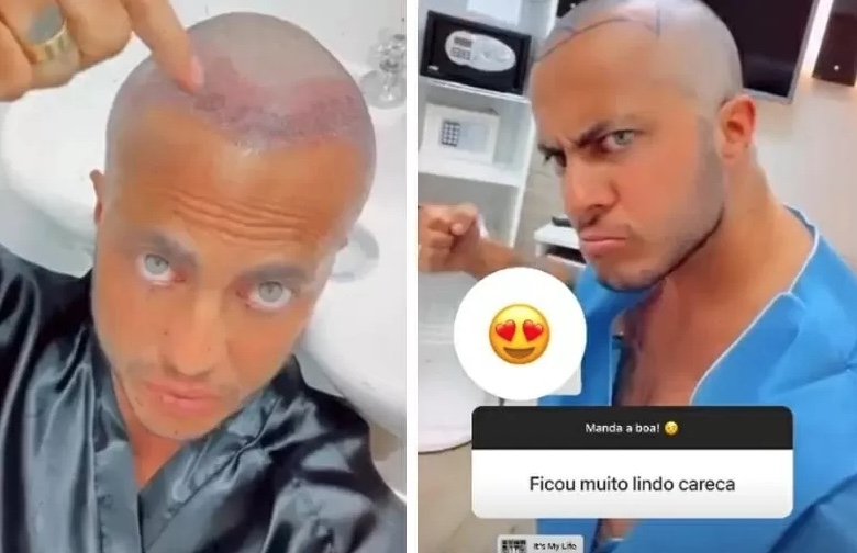 "Aqui é a área implantada e aqui a área doadora. Não sei de deu para vocês verem. Estou de parabéns. Já lavei o 'cabelo'. Daqui a 15 dias estará zero bala", disse.