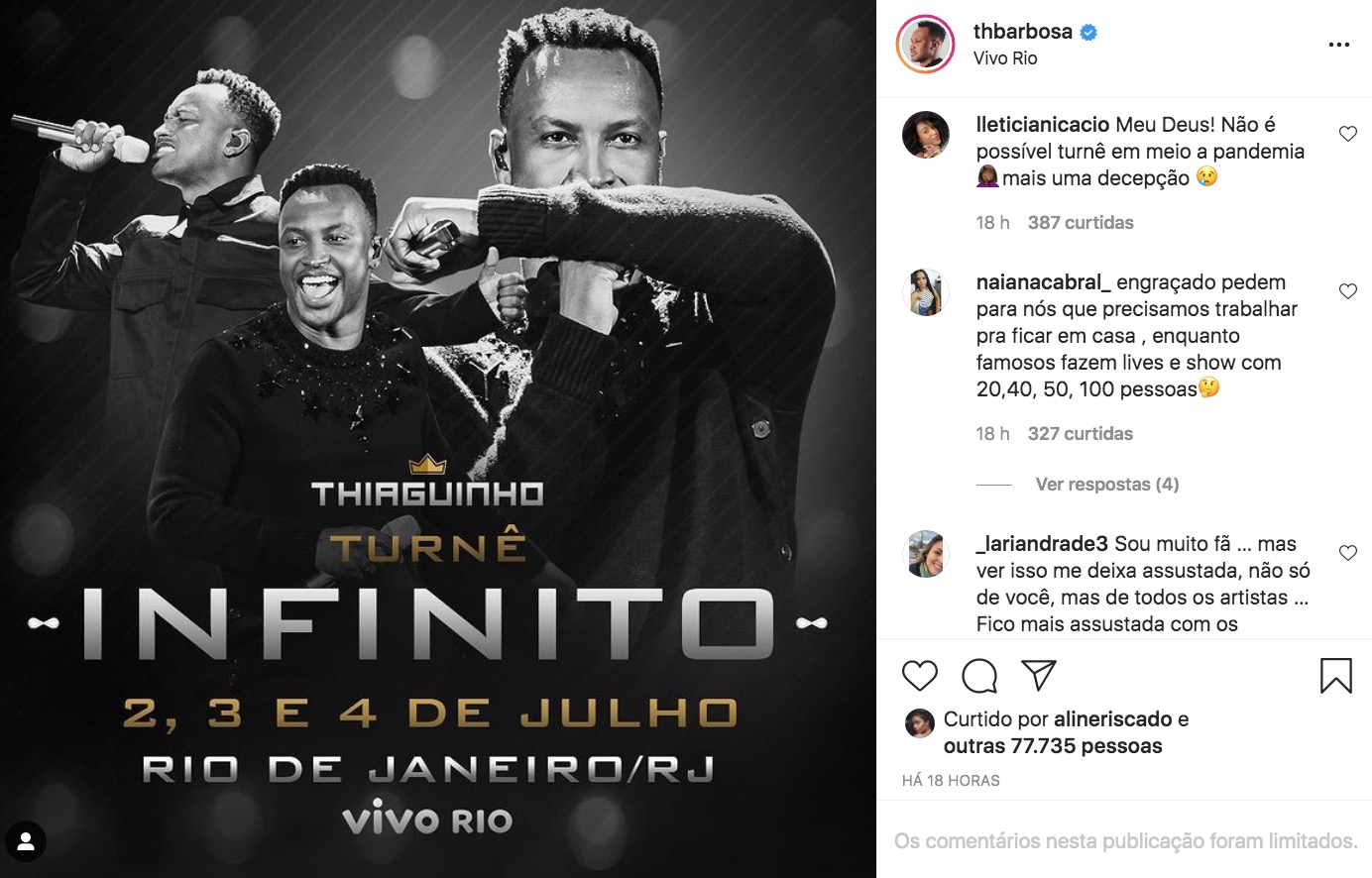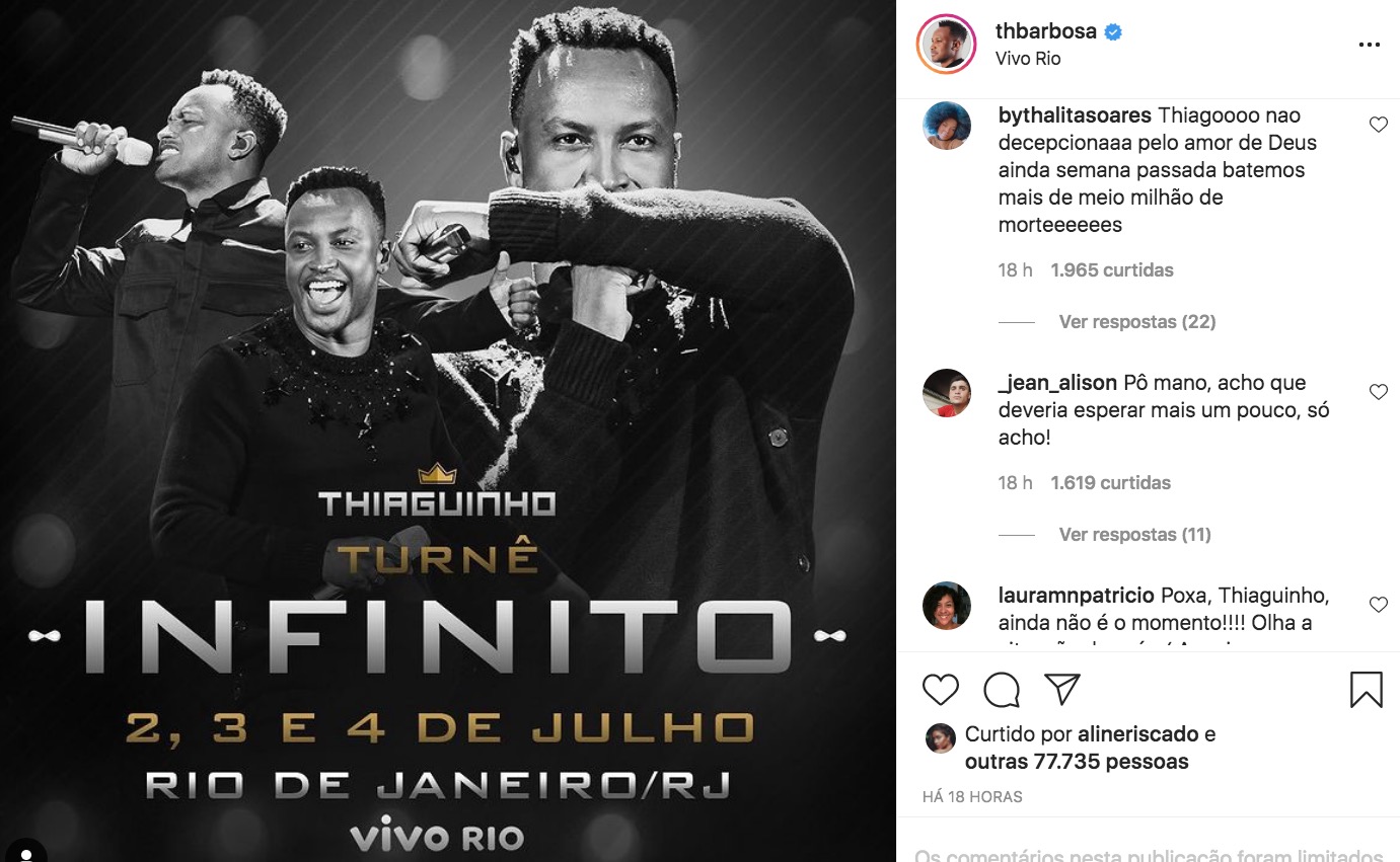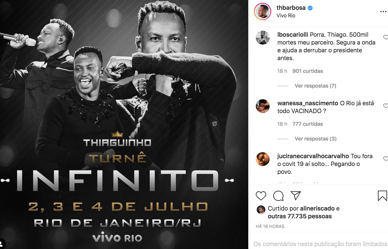 O cantor Thiaguinho causou polêmica após anunciar uma turnê, que começa no Rio de Janeiro nos dias 2,3 e 4 de julho. Internautas reprovaram a atitude do pagadeiro em incentivar a aglomeração após o Brasil atingir a marca de 500 mil mortos pela covid-19.