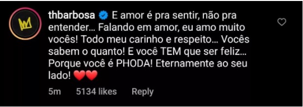 "E amor é pra sentir, não pra entender... Falando em amor, eu amo muito vocês! Todo meu carinho e respeito. Vocês sabem o quanto! E você tem que ser feliz. Porque você é foda! Eternamente ao seu lado!", escreveu o cantor no post de Fernanda.