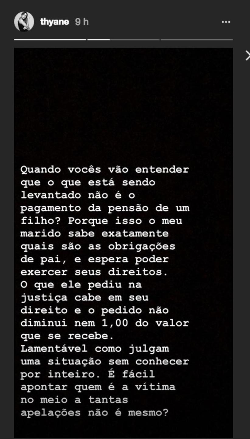 Depois, detonou: “Quando vocês vão entender que o que está sendo levantado não é o pagamento da pensão de um filho? Porque isso o meu marido sabe exatamente quais são as obrigações de pai, e espera poder exercer os seus direitos. O que ele pediu na justiça cabe em seu direito e o pedido não diminui nem 1,00 do valor que se recebe. Lamentável como julgam uma situação sem conhecer por direito. É fáci apontar quem é a vítima no meio a tantas apelações, não é mesmo?”, escreveu.