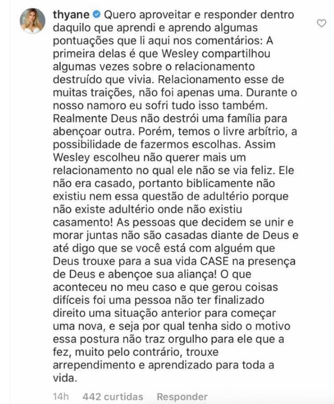 No desabafo, ela diz ainda que foi traída diversas vezes por Wesley quando eles ainda namoravam. Leia na íntegra o que Thyane escreveu: