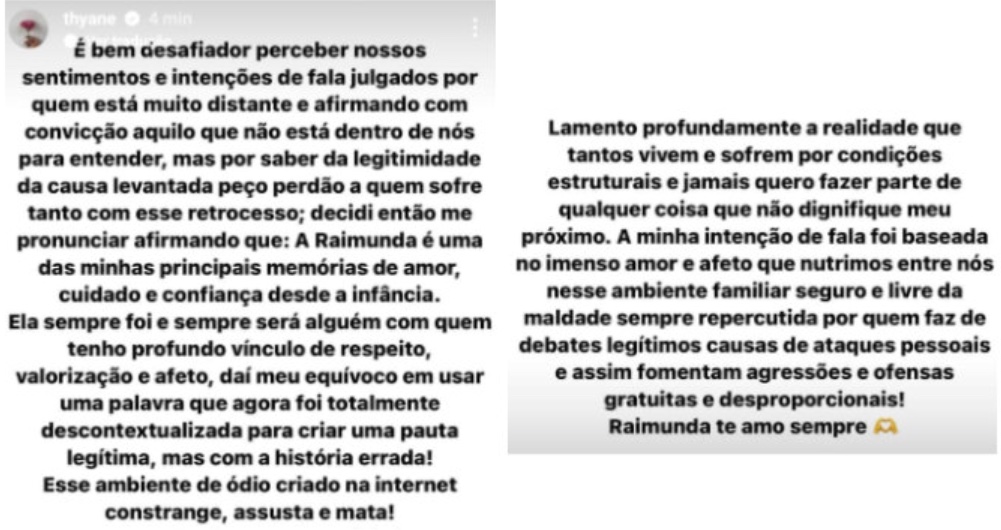 Thyane Dantas pediu desculpas através de um texto no Instagram após ter sido detonada por internautas ao dizer que Raimunda, que trabalha para sua família como empregada doméstica, foi um "presente" que recebeu da mãe quando casou com Wesley Safadão.