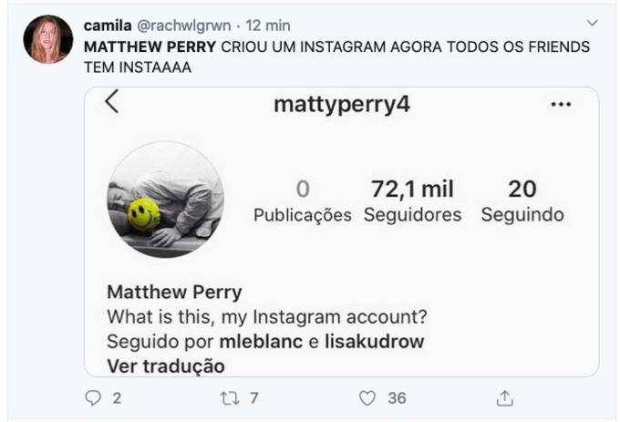 Para a felicidade dos fãs de Friends, Matthew Perry o eterno Chandler Bing, criou um perfil no Instagram. A novidade foi compartilhada por Lisa Kudrow, com uma foto das antigas. Os internautas comemoram muito nas redes sociais. "Finalmente!!! Aeee! Não acredito nos meus olhos, MEUS OLHOS”, legendou.