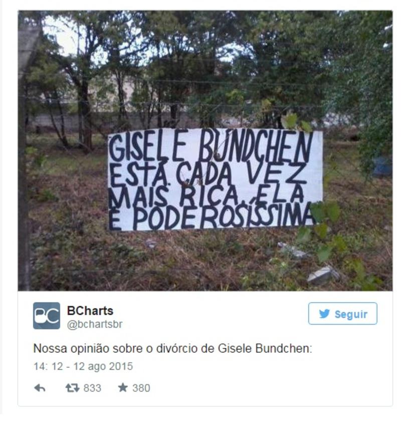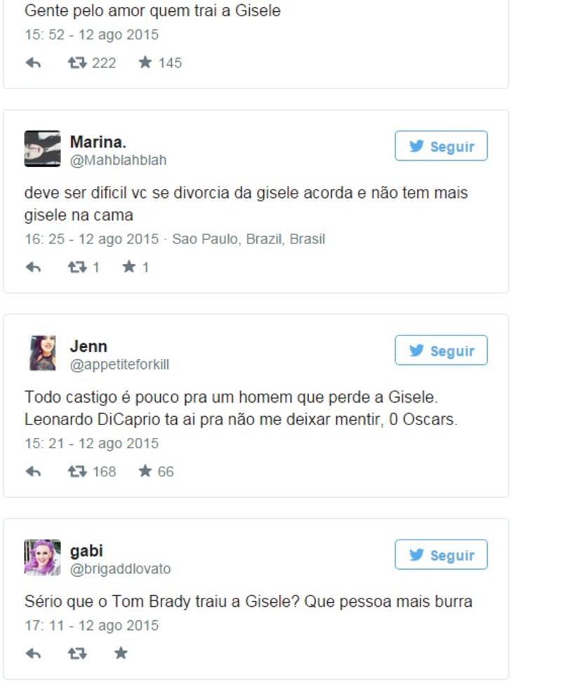 O suposto fim do casamento de Gisele Bündchen e Tom Brady não sai dos assuntos mais comentados na internet, e como não poderia deixar de ser, já virou até meme.Com rumores de que teria sido traída pelo jogador após uma foto da babá de Ben Affleck usando os anéis de Tom, a brasileira ganhou até um perfil no Tinder, aplicativo utilizado para paquera e encontros amorosos.
