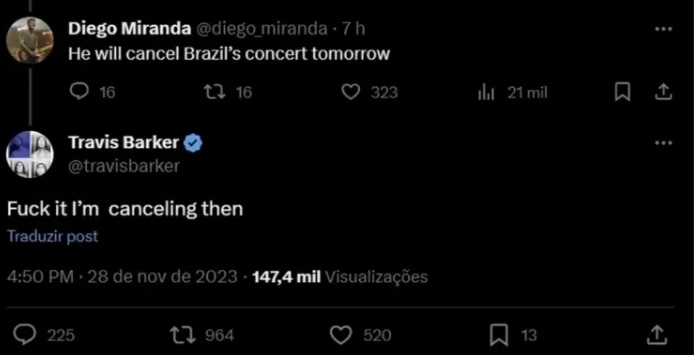 O cantor da Scracho respondeu, em inglês: "Ele vai cancelar o show no Brasil amanhã". Travis disparou em resposta: "Foda-se, vou cancelar então".