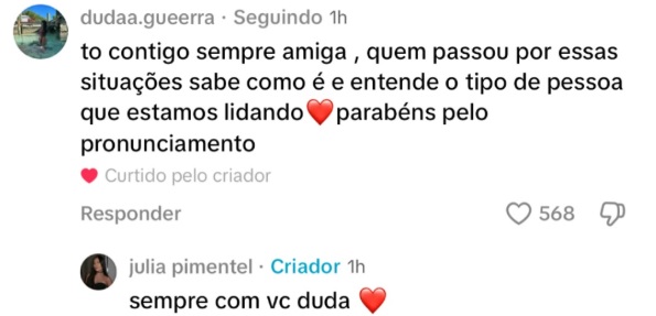 Diante da repercussão, Júlia Pimentel decidiu se pronunciar em vídeo, explicando seu afastamento de Antonela. Segundo ela, tudo começou após a amiga demonstrar interesse em Cauã, rapaz com quem Júlia se envolvia. “Eu estava mal por causa do término, e no mesmo dia que desabafei com ela, soube que a Antonela fez um comentário questionando se eu descobriria caso ela ficasse com ele”, contou. Júlia ainda afirmou que esse não foi um caso isolado, e que Antonela se recusou a pedir desculpas em outras situações semelhantes.