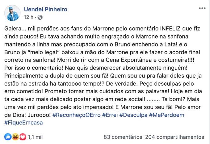 Não demorou muito e fãs da dupla Bruno e Marrone começaram a detonar a postura de Uendel. Após a polêmica, o cantor manauara se pronunciou: “Galera... mil perdões aos fans do Marrone pelo comentário INFELIZ que fiz ainda pouco! Eu tava achando muito engraçado o Marrone na sanfona mantendo a linha mas preocupado com o Bruno enchendo a Lata! e o Bruno ja “meio legal” baixou a mão do Marrone pra ele fazer o acorde final correto na sanfona! Morri de rir com a Cena Expontânea e costumeira!!!! Por isso o comentario! Nao quis desmerecer absolutamente ninguém! Principalmente a dupla de quem sou fã! Quem sou eu pra falar deles que ja estão na estrada ha tantoooo tempo!? De verdade. Peço desculpas pelo erro cometido! Prometo tomar mais cuidados com as palavras! Hoje em dia ta cada vez mais delicado postar algo em rede social! ........ Ta bom!? Mais uma vez mil perdões pelo ato impensado! E Marrone sou seu fã! Pelo amor de Dios! Juroooo! #ReconheçoOErro #Errei #Desculpa #MePerdoem #FiqueEmcasa”, escreveu.