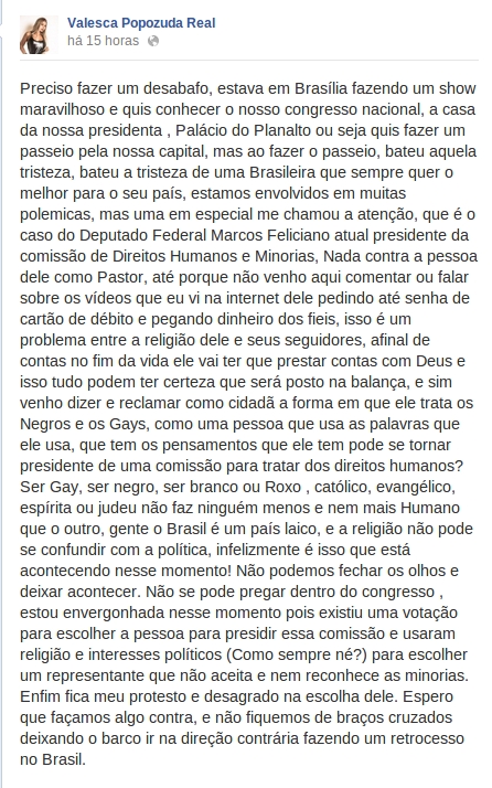 Valesca Popozuda aproveitou a sua passagem por Brasília, no Distrito Federal, para visitar o Congresso Nacional neste domingo (17). No Facebook, a funkeira publicou sua reflexão sobre a polêmica do Deputado Marco Feliciano e suas declarações sobre homossexuais, negros e portadores de HIV e AIDS.