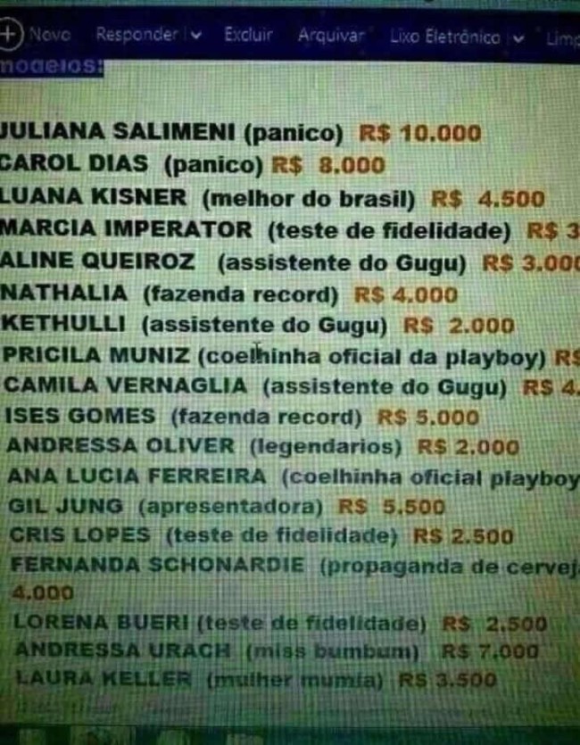 Uma lista de mulheres celebridades está dando o que falar na internet. Segundo o site Bom Dia, uma cafetina, já conhecida por outros casos, divulgou uma lista com a tabela de preços para programas com as famosas. Entre as mulheres estaria Juliana Salimeni (Juju Ex-Panicat), que teria o preço mais alto (avaliado em 10 mil reais), Carol Dias, Andressa Urach, coelhinhas da Playboy e outras muitas conhecidas da mídia.