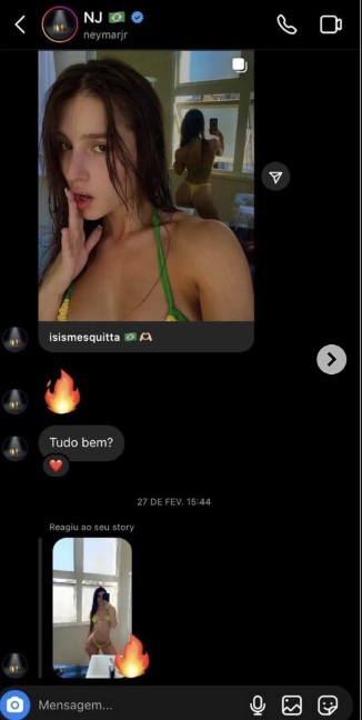 Nesta quinta-feira (29), Isis Mesquitta, que é seguida pelo craque no Instagram, mostrou que recebeu cantadas dele em 27 de fevereiro, data em que o jogador estava recém-reconciliado com a namorada.