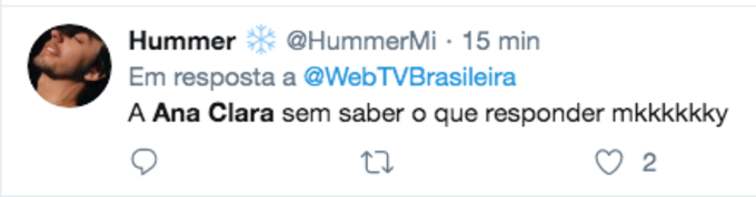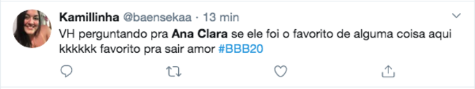 “Teve algum momento que fui favorito ou nunca rolou?”, perguntou ele. Sem jeito, Ana Clara preferiu não responder de forma direta: "Isso só o público vai poder te dizer”. Atentos ao bate papo, o público não perdoou a cena e o brother criticado nas redes sociais.