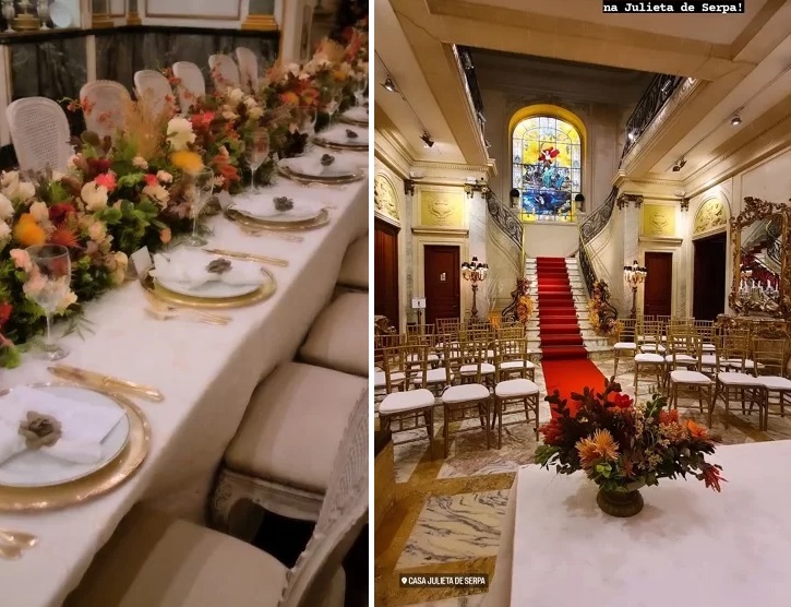 O casal apareceu vestido de noivos em uma escadaria, em uma foto publicada pelo perfil Segue a Cami, no Instagram. A cerimônia foi um 'mini wedding' e contou com uma grande mesa de jantar repleta de flores.