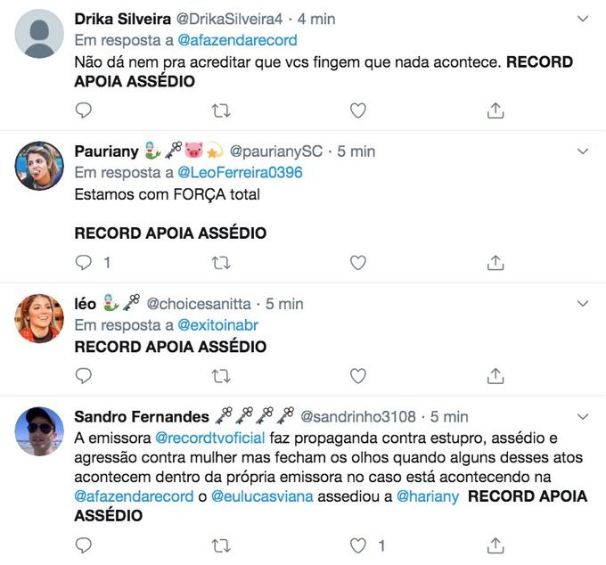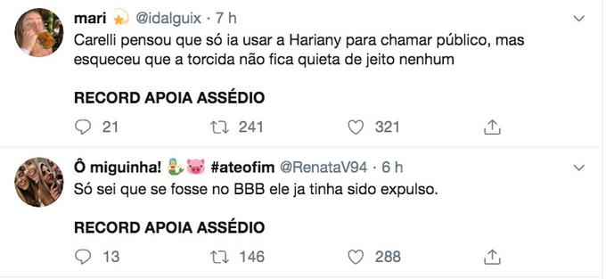 No Twitter, a hashtag “Record Apoia Assédio” é um dos assuntos mais comentados. Muitos querem um posicionamento da emissora.