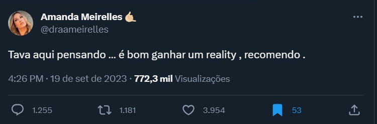 No Twitter, Amanda mandou uma indireta que muitos internautas apontaram que seria para Cezar. "Tava aqui pensando … é bom ganhar um reality , recomendo .", escreveu.