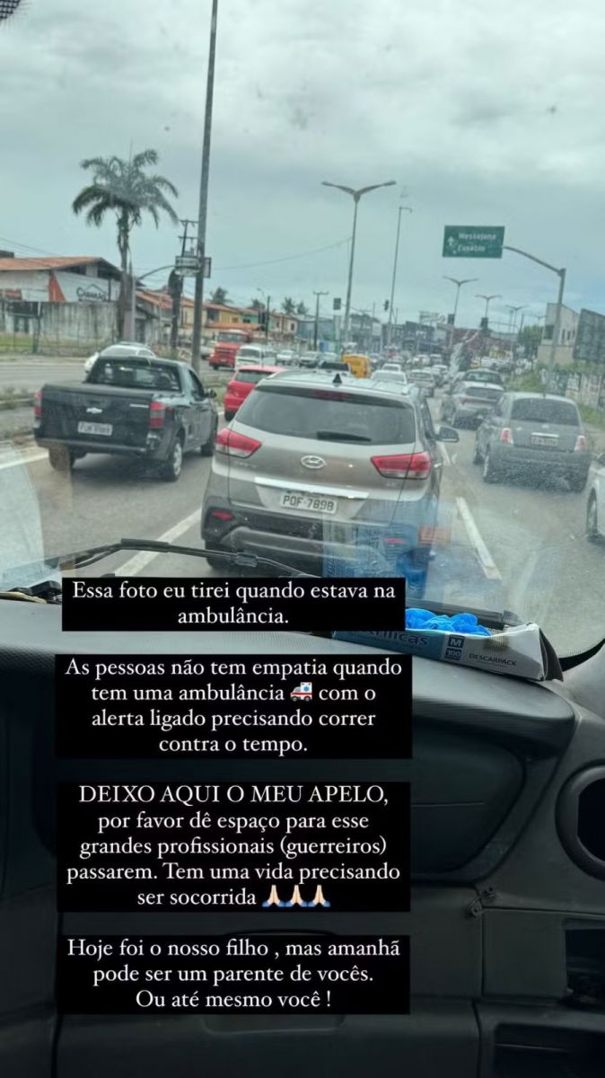 Ingra também publicou uma foto do trânsito enfrentado até o hospital, mostrando que os motoristas não abriam caminho: “As pessoas não têm empatia”, desabafou.