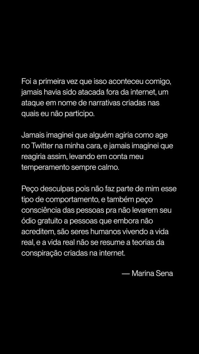 A situação ocorreu no último 7 de setembro, mas foi divulgada hoje (16) pelo perfil de fofocas no Instagram Subcelebrities. O vídeo viralizou, e Marina se pronunciou, afirmando que nunca imaginou que seria atacada pessoalmente da mesma forma em que é atacada nas redes sociais, nem tampouco imaginou que agiria dessa forma, revidando.