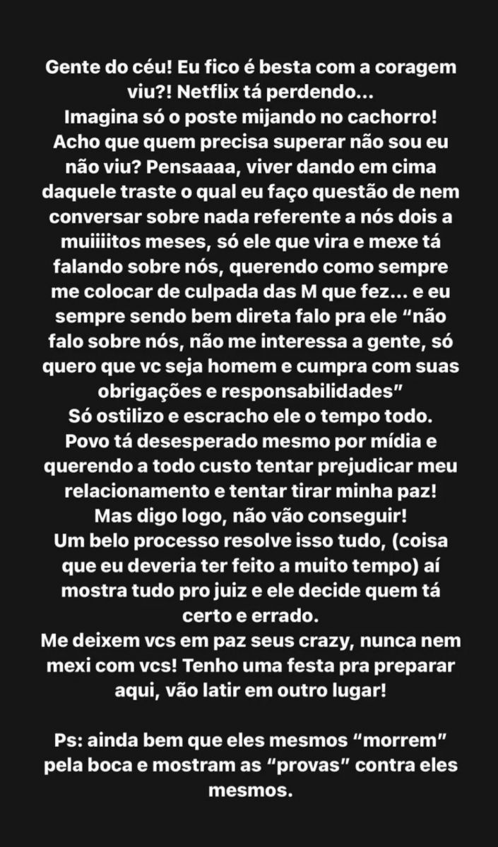 Ao ficar sabendo das declarações de Rayanne, Renata Muller usou o Instagram para rebater a atual noiva de seu ex-marido, com quem ficou por 13 anos. Confira: