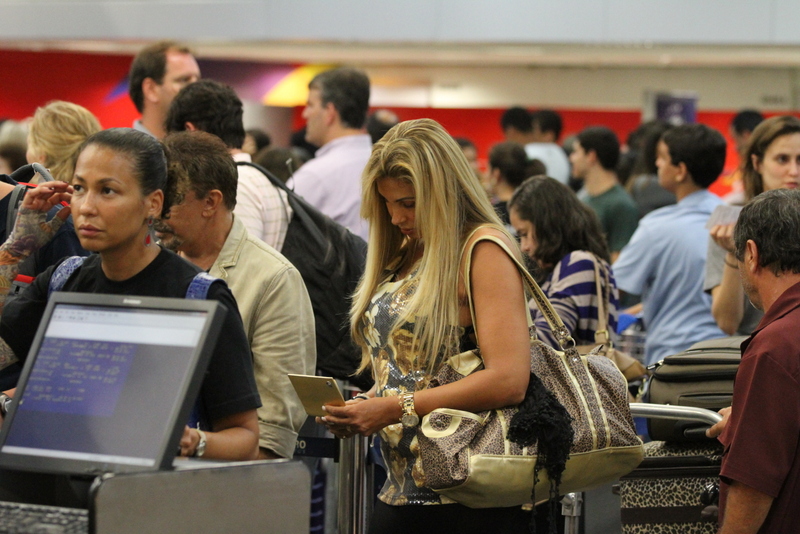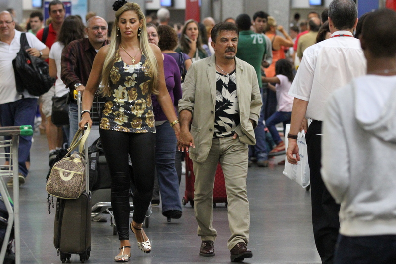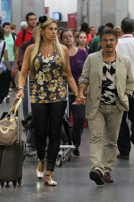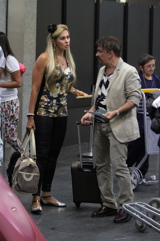 Os dois embarcaram em lua de mel para Miami, no aeroporto de Galeão, no Rio, nesta quinta-feira, 03, e como todos os passageiros, o casal enfrentou fila e Ângela não pareceu muito animada.