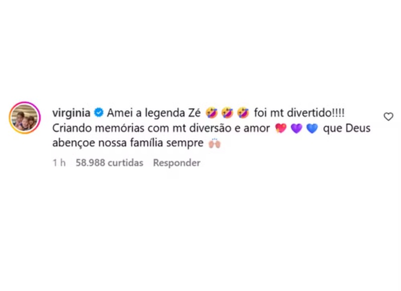 Apesar de a publicação aparecer como colaboração, foi Zé Felipe quem postou as fotos e marcou o local do evento. Nos comentários, Virginia reagiu com bom humor: “Amei a legenda Zé. foi muito divertido!!!! Criando memórias com muita diversão e amor. que Deus abençoe nossa família sempre”. Seguidores celebraram o reencontro e pediram a reconciliação.