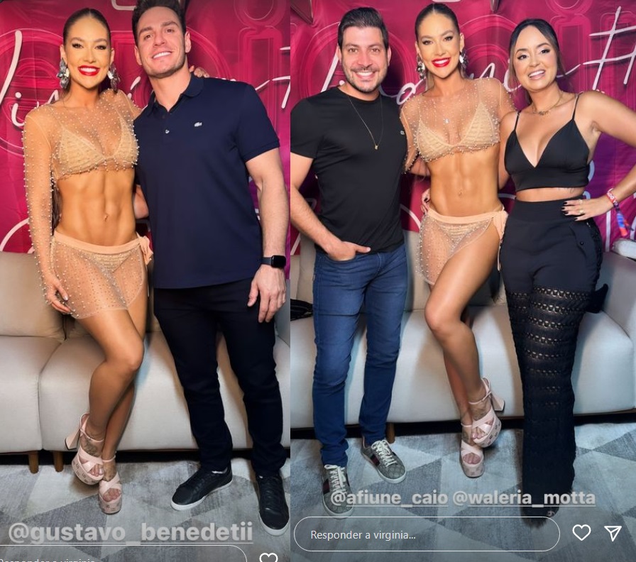 Para o look, Virginia escolheu cropped e minissaia transparentes, com calcinha e sutiã nude, deixando em evidência os seus gominhos na barriga.