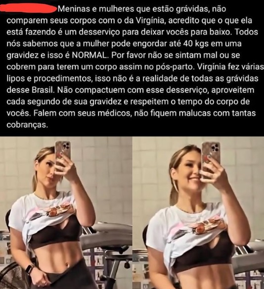 A influenciadora, que engravidou pouco após se submeter a uma lipo LAD, lipoaspiração da “moda” que define o abdômen, surgiu malhando na academia, e levantando a camisa para exibir a barriga.