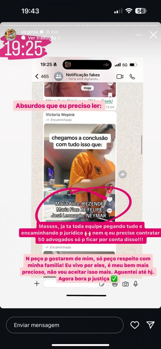 A influenciadora reagiu às especulações que tomaram a internet, de que a criança seria filha de Rezende, seu ex-namorado, e não de Zé Felipe. Um dos prints expostos por Virgínia era de um internauta afirmando que Maria Flor é filha de Rezende, Maria Alice, de Zé Felipe, e José Leonardo (que ainda está na barriga), de Neymar.