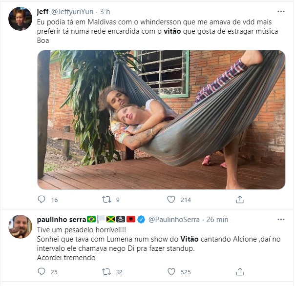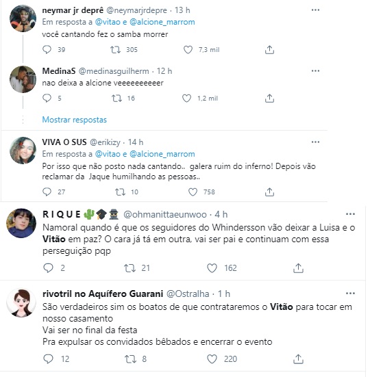 A situação saiu do controle ainda mais após Vitão voltar ao Twitter para deixar um recado: “ Vocês não se preocupam com a saúde psicológica e emocional de ninguém , vocês não sabem porra nenhuma de música brasileira, vocês precisam de terapia, de remédio, de sexo e estudo. gente que só faz peso na terra. graças a Deus eu não sou tão burro pra acreditar na verdade de vcs”.