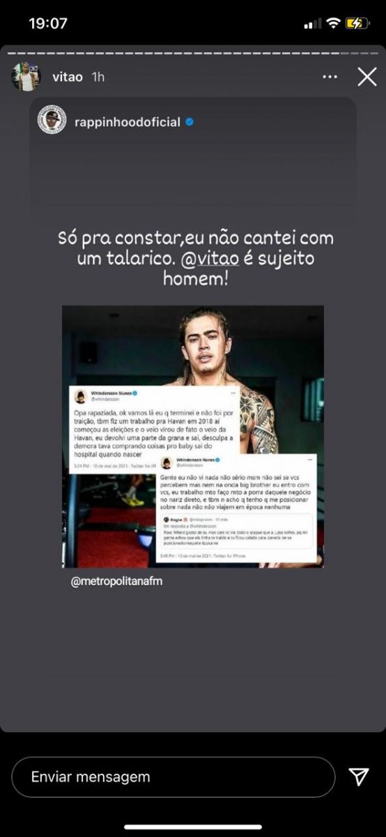 Após o fim do relacionamento entre Whindersson e Luísa Sonza vir à tona nesta segunda-feira (10), o cantor Vitão, na época considerado pivô do fim do relacionamento, também falou em suas redes sociais.