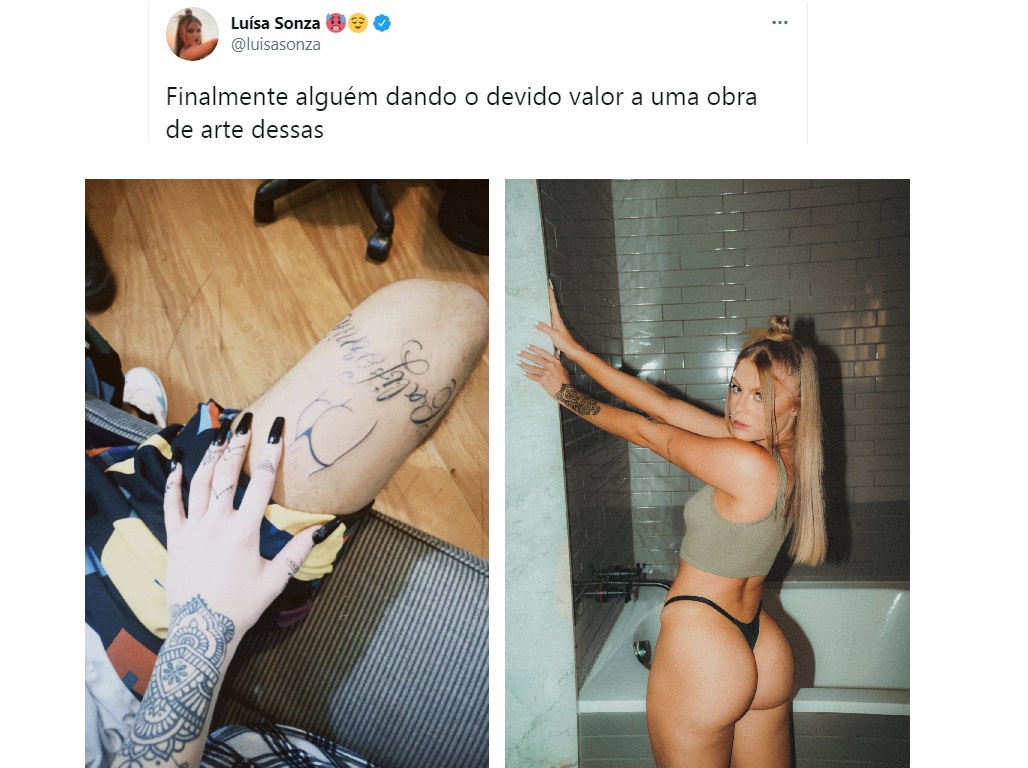 O desenho inspirado em uma foto recente da cantora de fio-dental, foi feito na perna de Vitão. Luísa postou a foto do resultado, com a sua mão segurando a coxa do namorado.
