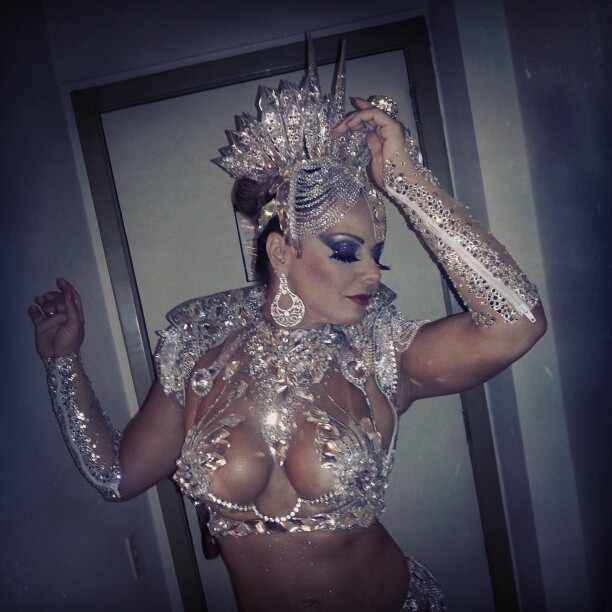 Depois de desfilar com a fantasia que teria custado R$ 200 mil no carnaval carioca, Viviane Araújo posou novamente com o traje, antes de desfilar no carnaval de Uruguaiana, no Rio Grande do Sul, nesse sábado, 2.