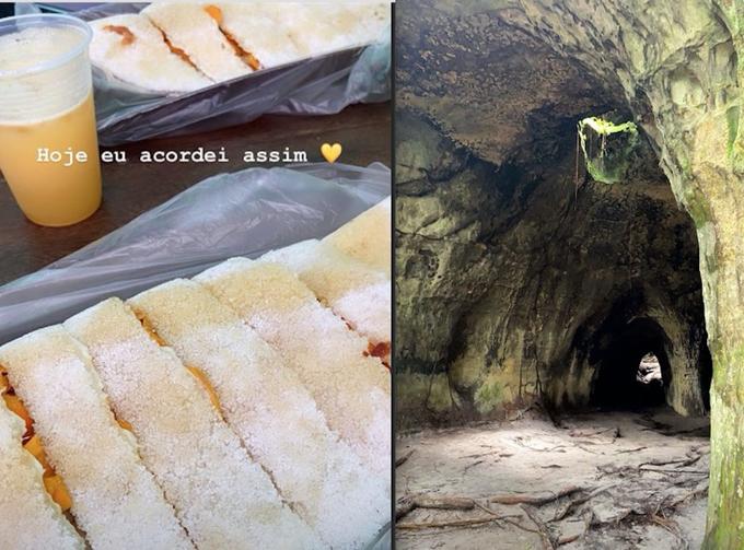 Leo se encantou ao filmar a floresta: "Som dos pássaros", escreveu ele, que antes mostrou a foto de uma gruta. E antes, ao começar o dia, comeu o café da manhã perfeito: tapioca de tucumã e queijo. "Hoje eu acordei assim", escreveu.