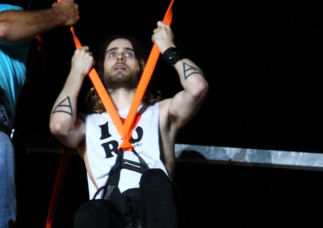Jared Leto fez um show à parte na noite deste sábado, 14, no segundo dia do Rock in Rio 2013 . O vocalista da banda americana 30 Seconds To Mars se mostrou super à vontade e saltou do tirolesa em meio à multidão de fãs, e ainda tomou açaí no palco principal da Cidade do Rock. Além de vocalista da banda de sucesso, Leto é um ator bem sucedido, tendo feito filmes como " Requiem Para um Sonho ", " O Quarto do Pânico ", " Sr. Ninguém ", " Capítulo 27 - O Assassinato de John Lennon ", entre outros.